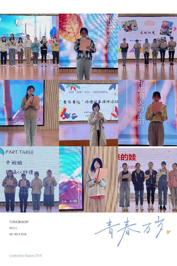中班组老师的情景剧表演《幼儿园那些事》,将幼儿成长、新教师发展的经历搬上舞台。从她们的演绎中,一幕幕熟悉的场景情境再现,一个个真实的故事触动人心,让每位老师都似乎找到了自己的身影。另一组老师的《师德颂》,在娓娓讲述中诠释了教育的真谛。她们无怨无悔,不计名利,积极进取,努力创新,尽心尽责地完成每一项教学任务,不求最好,但求更好!